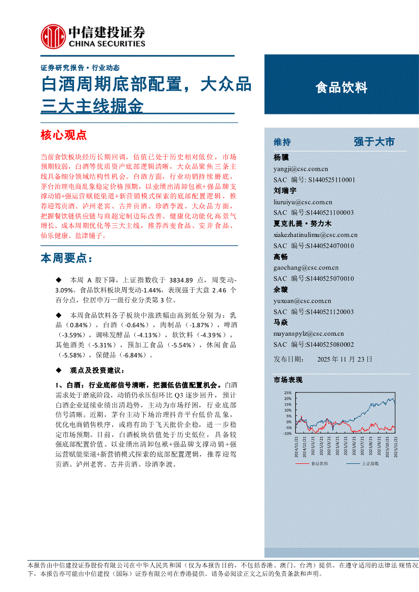 1。 用户间接或通过各类体例间接利用慧博投研资讯所供给的办事和数据的行为,都将被视做已无前提接管本声明所涉全数内容;若用户对本声明的任何条目有,请遏制利用慧博投研资讯所供给的全数办事。2。 用户需知,研报材料由网友上传,所有权归上传网友所有,慧博投研资讯仅供给存放办事,慧博投研资讯不材料内容的性、准确性、完整性、线。 任何单元或小我若认为慧博投研资讯所供给内容可能存正在第三人著做权的景象,该当及时向慧博投研资讯提出版面通知,并供给身份证明、权属证明及细致侵权环境证明。慧博投研资讯将遵照版权赞扬处置该消息内容;当前食饮板块履历持久回调,估值已处于汗青相对低位,市场预期较弱,白酒等优良资产底部逻辑清晰,公共品聚焦从线具备细分范畴布局性机遇。白酒方面,行业动销持续磨底,茅台管理电商乱象不变价钱预期,以业绩出清卸负担+强品牌支持动销+强运营赋能渠道+新营销模式摸索的底部设置装备摆设逻辑,保举送驾贡酒、泸州老窖、古井贡酒、珍酒李渡。(慧博投研资讯)公共品方面,把握餐饮链供应链取商超定制边际改善、健康化功能化高景气增加、成本周期优化等三大从线,保举西麦食物、安井食物、盐津铺子。本周要点:本周A股下降,上证指数收于3834。89点,周变更3。09%。食物饮料板块周变更-1。44%,表示强于大盘2。46个百分点,位居申万一级行业分类第3位。本周食物饮料各子板块中涨跌幅由高到低别离为:乳品(0。84%),白酒(-0。64%),肉成品(-1。87%),啤酒(-3。59%),调味发酵品(-4。13%),软饮料(-4。39%),其他酒类(-5。31%),预加工食物(-5。54%),休闲食物(-5。58%),保健品(-6。84%)。1、白酒:行业底部信号清晰,把握低估值设置装备摆设机遇。白酒需求处于磨底阶段,估计白酒企业延续业绩出清趋向,自动为市场纾困,行业底部信号清晰。近期,茅台自动管理抖音平台低价乱象,优化电商发卖次序,或将有帮于批价企稳,进一步不变市场预期。目前,白酒板块估值处于汗青低位,具备较强底部设置装备摆设价值。以业绩出清卸负担+强品牌支持动销+强运营赋能渠道+新营销模式摸索的底部设置装备摆设逻辑,保举送驾贡酒、泸州老窖、古井贡酒、珍酒李渡。2、公共品:聚焦从线,把握细分范畴布局性机遇。1)餐饮链供应链取商超定制。进入四时度保守旺季,餐饮供应链逐步削减价钱合作性收入,且渠道库存负担较轻,合作优化,叠加部门企业商超定制产物进入放量期,估计需求逐渐改善。十月稻田。2)健康化赛道取功能化大单品。西麦受益于“燕麦+”健康化赛道高景气取新零售渠道驱动业绩增加,燕麦粒采购价下行利润弹性。仙乐健康国内收入持续改善,新消费客户表示亮眼,估计BF年内剥离PC营业,关税冲击落地,看好26年利润弹性。保举西麦食物、仙乐健康、盐津铺子。3)成本周期改善。原奶周期拐点将至,利好龙头液奶需求修复,品类布局性增加机遇凸显。酵母糖蜜新榨季估计采购成本下降,保举伊利股份、安琪酵母。此前抖音平台低价茅台乱象凸起,本周该环境显著改善。经抖音对相关店肆研判调整及价钱管理后,17日平台正在售的53度茅台价钱根基不变正在1700元及以上,止住低价颓势,虽仍有少量从播兜销低价茅台,但多量违规低价链接被处置,此举必然程度上缓解了对线下正轨经销商的冲击,利于稳住茅台批价取渠道决心。瞻望将来,国内经济无望逐步企稳回升,以白酒为代表的顺周期财产无望从头步入高增加通道。沉点公司批价:茅台整箱、散瓶价钱别离为1665元/瓶、1655元/瓶,别离环比上周-5元、-5元。五粮液八代批价不变正在855元/瓶。爱惜当前低位结构机遇。高端及稳健龙头酒企:茅台、五粮液、泸州老窖等凭仗强品牌力和刚性需求,将率先受益于商务、礼物消费苏醒,业绩确定性高,报答以稳为从。这类企业不只能获得估值修复带来的收益,其不变的运营还能供给≥3%的股息率,分析报答率估算计高。次高端及区域弹性酒企:山西汾酒、古井贡酒等区域龙头凭仗深挚的市场根底和精细化运营,正在宴席等公共需求苏醒中无望实现份额提拔。蓄力型酒企:珍酒李渡等通过招商优化、产物立异拓展市场的企业,若阶段性招商调整收效、动销超预期,可能收成超额报答,别的如酒鬼酒、舍得酒业等颠末2025年库存去化和报表调整,2026年若送来动销拐点,修复弹性较大。据国度统计局数据显示,2025年1-10月规模以上企业累计啤酒产量3163。1万千升,同比增加0。0%。此中,10月规模以上企业啤酒产量179。4万千升,同比下降1。0%,受餐饮相对疲软、去库存等要素影响,啤酒行业Q4销量边际仍有走弱趋向,关心库存调整完成后餐饮苏醒进度。啤酒行业处于本钱开支末期,华润青啤等分红比例仍有提拔空间,沉啤、百威亚太分红率正在100%摆布,盈利属性凸起。燕京啤酒26年仍具备成长性,短期股价回调后,设置装备摆设价值彰显。保举α凸起的燕京啤酒以及高股息率、盈利属性较强的青啤(H)、沉庆啤酒。本周伊利召开投资者日,公司认为乳操行业从“普适性增加”进入“布局性增加”新阶段。将来五年,下沉市场仍有液奶需求,高线城市需求升级鞭策多元化增加(好比场景多元化),公司也将发力养分品、奶酪、B2B及乳深加工等差同化赛道,婴配粉持续提拔市场份额,海外营业方针10年内冲破百亿,全体带动公司收入快于行业及P增速,且净利率进一步提拔